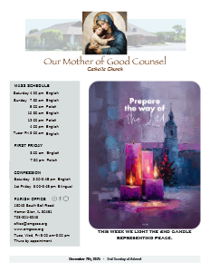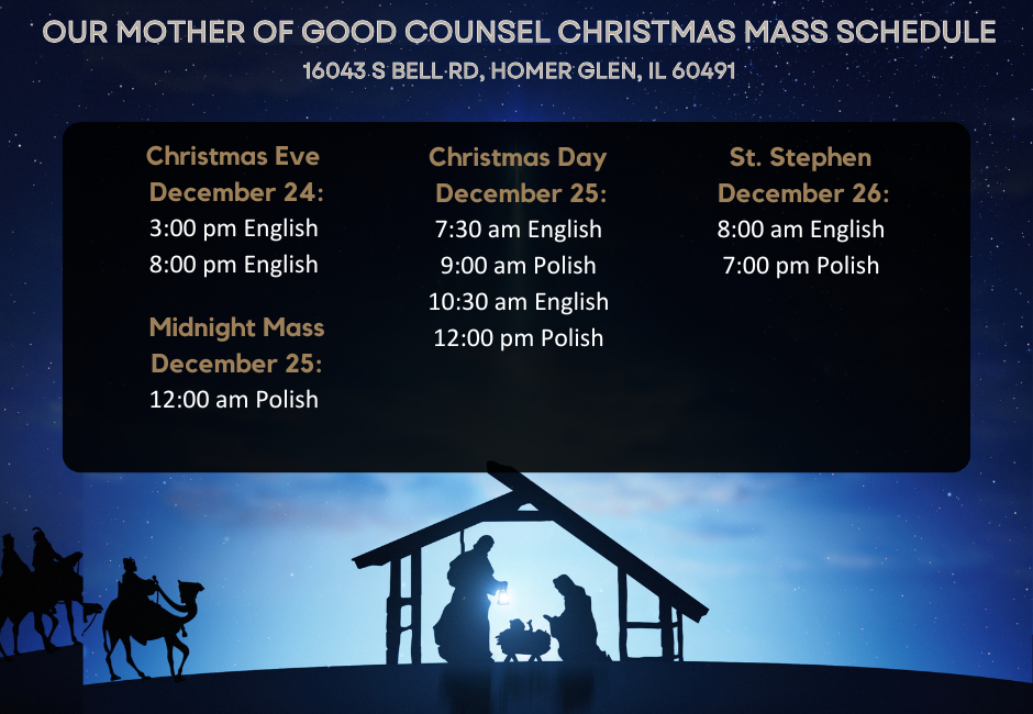 Our annual Christmas Concert is Sunday, December 14th at 5:00 PM. Please note the 4:00 PM Mass is canceled that day.